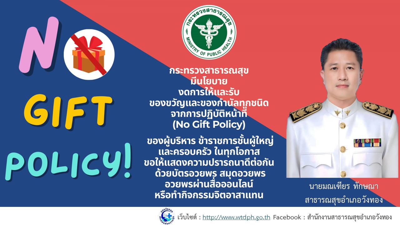 1.1 ประกาศเจตนารมณ์เป็นหน่วยงานที่เจ้าหน้าที่ของรัฐทุกคนไม่รับของขวัญและของกำนัลทุกชนิดจากการปฏิบัติหน้าที่ (No Gift Policy) ของปีงบประมาณ พ.ศ. 2569 ที่มีลักษณะเป็น Infographic No Gift Policy ในนามหัวหน้าหน่วยงานอยู่หน้าเว็บไซต์หลักของหน่วยงาน